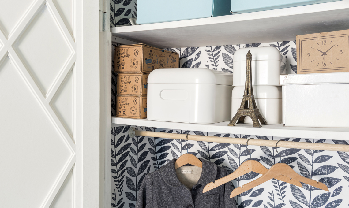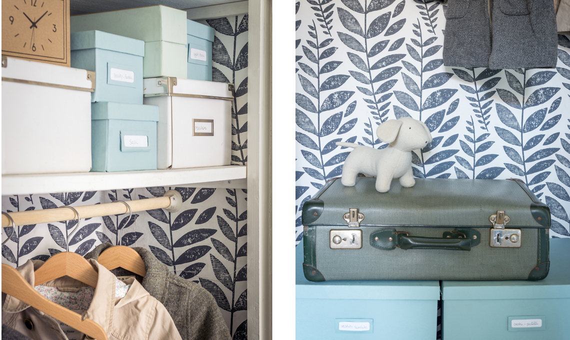 Per dare personalità all’armadio è stata applicata alla parete di fondo e a quelle laterali una carta da parati stampata con foglie e rami color denim su fondo bianco: si tratta di Odhni Indigo di [Designers Guild]. In alternativa, puoi creare un decoro a stencil.