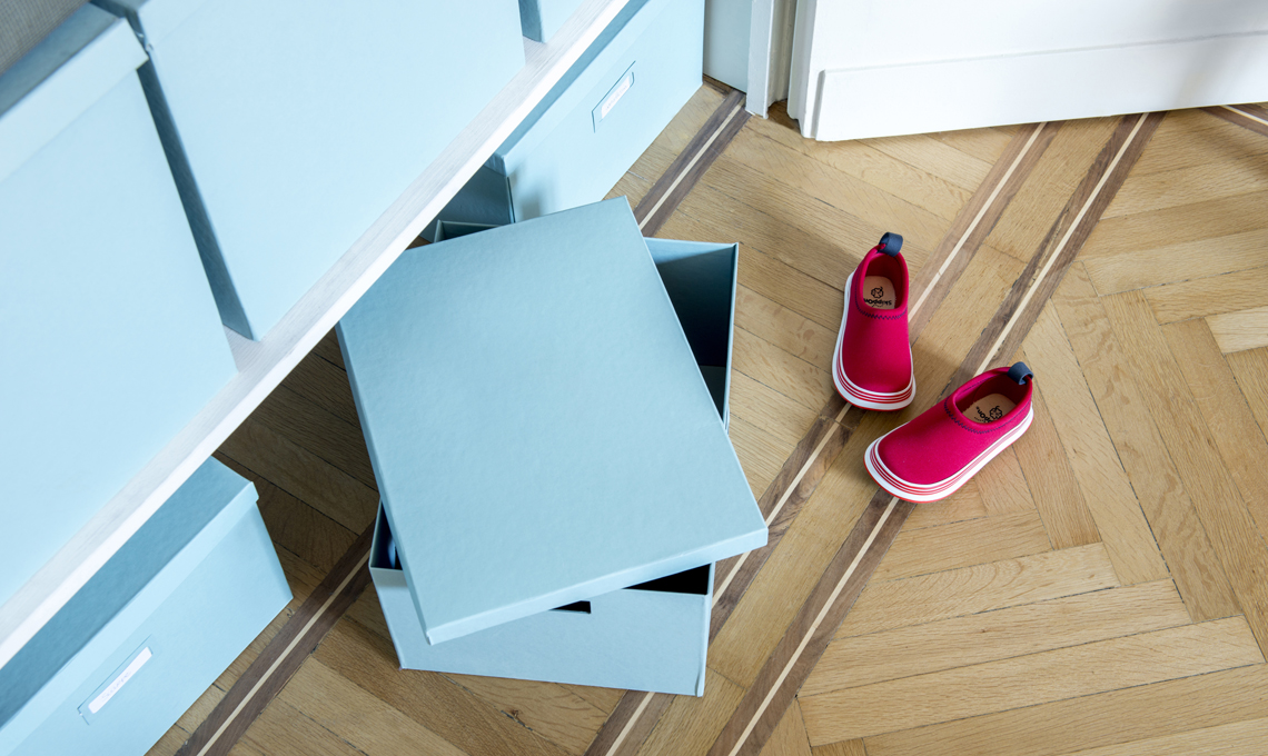 Nelle case di fine ’800, spesso si avevano a disposizione due ingressi, uno ‘ufficiale’ e uno di servizio. Nel nostro caso, il secondo – che si apriva su quella che ora è la camera dei bambini – è stato chiuso e se ne è ricavata una nicchia profonda 40 cm, impreziosita dalla cornice e dalla porta a due ante, entrambe originali della casa. Un semplice restyling ha dato vita a un guardaroba per i vestiti e gli accessori dei figli (ma è un’idea da copiare per ogni ambiente...), reso allegro dalla tappezzeria a foliage in bianco e denim e dalle tante scatole azzurre che sostituiscono i cassetti e poggiano a terra e sulle tre mensole.