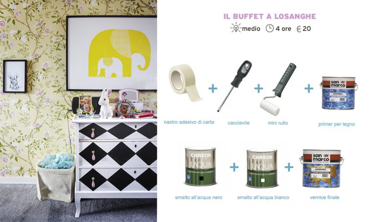 2 Listelli in abete 2x4,5x100 cm 4 listelli in abete 3,5x4,5x200 cm 8 pannelli in mdf 0,3x50,5x106 cm Chiodini testa piana lunghi 25 mm Colla Millechiodi per legno Viti per legno lunghe 60 mm Viti piccole lunghe 16 mm 4 fogli di carta abrasiva grana 80/120/180 Stucco riempitivo bianco in pasta Spatola per stucco da 2 cm 1 piattina di abete bianca 2x0,5x240 cm Smalto bianco all’acqua Luxens 0,5L Pennello per carta da parati 120 mm Spatola per carta da parati Rullo multisupporto da 60 mm Pennello per legno 30 mm Carta da parati Heisenberg 100x200cm (LondonArt)