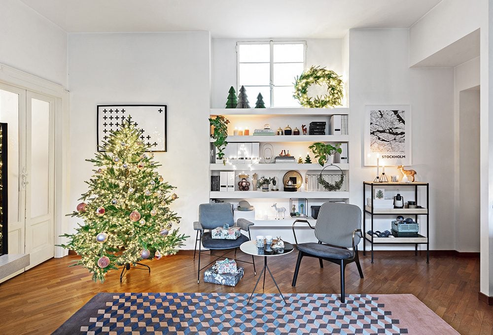 Mobile Besta [Ikea], carta da parati Heisenberg [LondonArt, € 89/mq], sedia Serie 7 [Fritz Hansen, cm 50x52x80,5h €397], sedia DSW [Vitra, cm 46,5x55x83 €395], sedia Cream [Calligaris, cm 40x50x81,5 €175]. Mobile a giorno [B&B Italia]. Stampa incorniciata con donna stilizzata [posterlounge.it].
