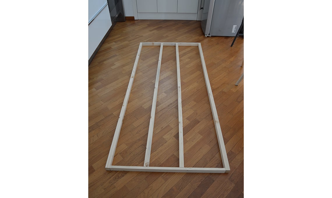Tagliare i 2 listelli corti (2x4,5x100cm) portandoli a una lunghezza di 92cm. Tagliare 2 listelli lunghi (3,5x4,5x200cm) ridimensionandoli a 196 cm, i restanti due vanno lasciati della loro lunghezza originale. Appoggiare i 6 listelli a terra e comporre il telaio controllando che siano in bolla tra loro.