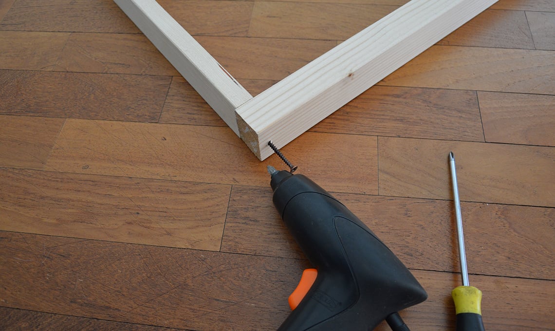 Fissare con la millechiodi i punti di giuntura dei listelli. Quando la colla è asciutta forare il legno con il trapano per creare la guida per le viti che terranno ferma la struttura. Aiutandosi con l’avvitatore, inserire le viti (8 in totale). Avvita al massimo, meglio ancora se la testa della vite entra leggermente nel listello.