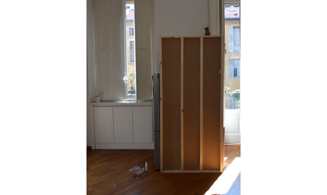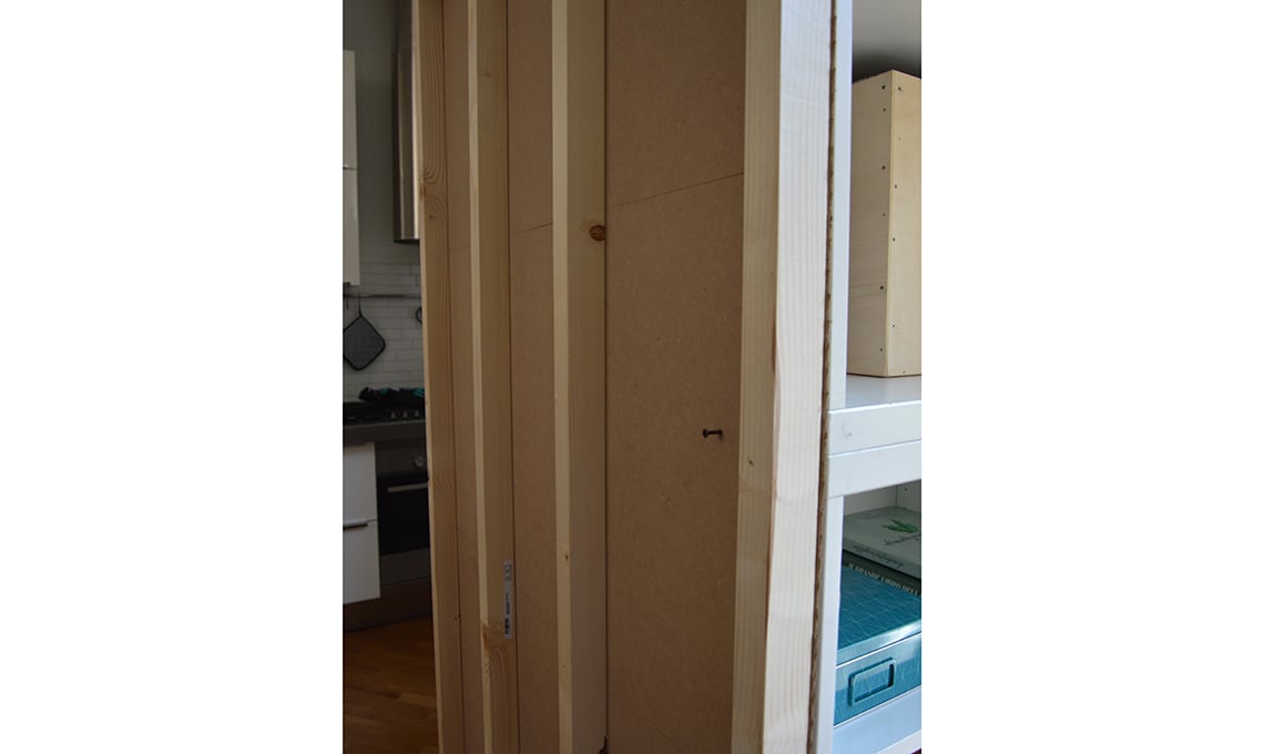Aiutandosi con i chiodini da 25mm, fissare alla struttura quattro pannelli sovrapposti: 3 pannelli 100x50,5cm e 1 pannelli 100x48,5cm. In questo modo avremo tamponato un lato della paretina. Quando la prima parte della struttura è pronta, sollevarla e appoggiarla al laterale del mobile Bestå, puoi aiutarti con un paio di morsetti per tenere fermo il tutto.