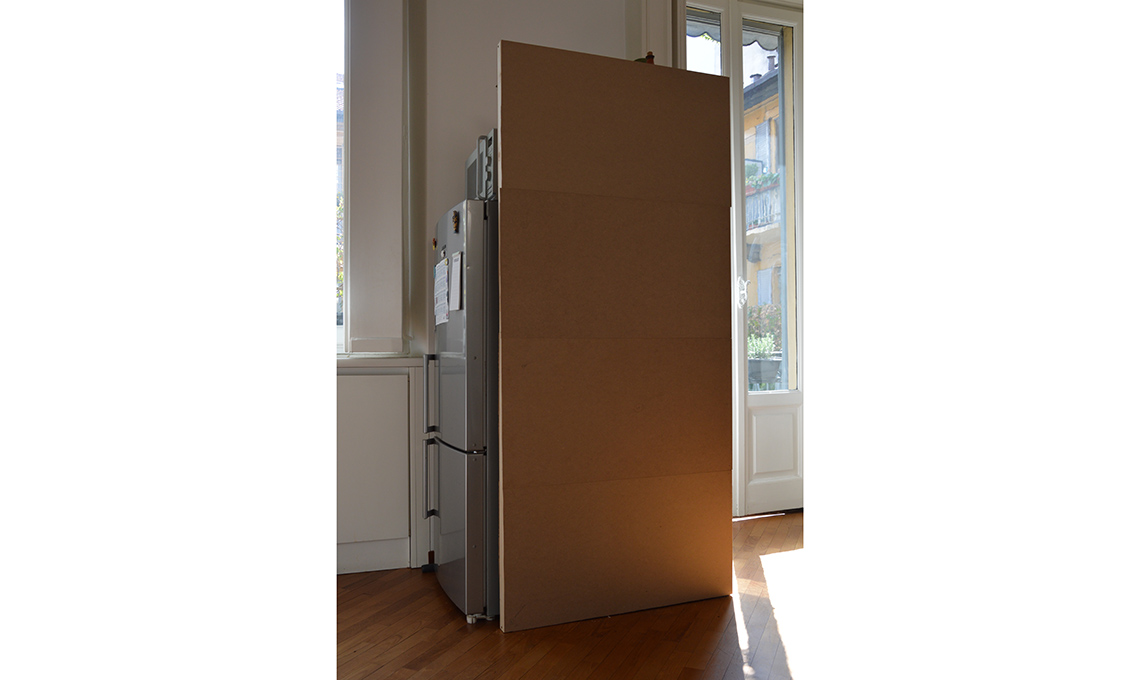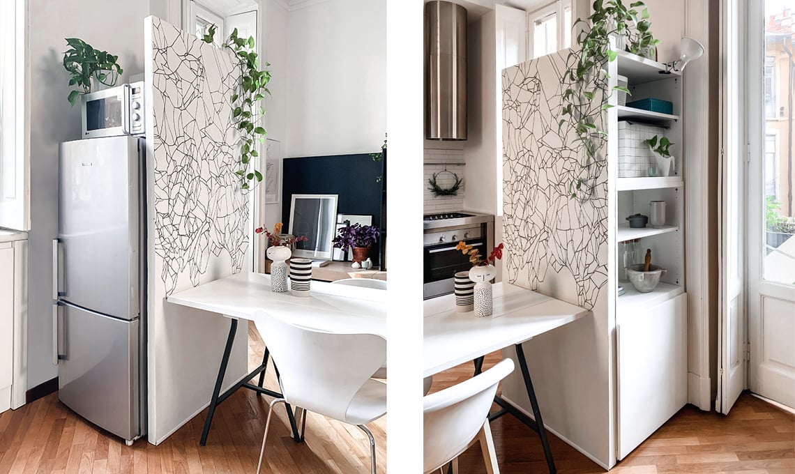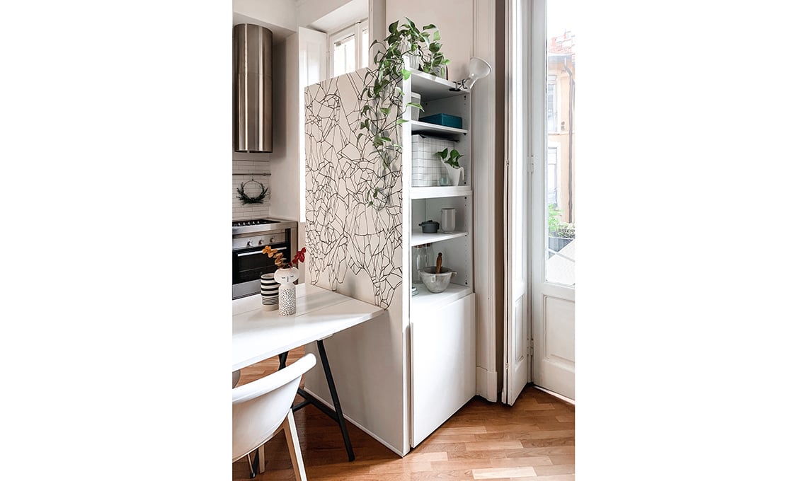 Ho poi costruito una piccola quinta in legno MDF per coprire il lato del frigorifero: una struttura semplice e leggera ancorata al mobile, senza bisogno di incidere sul pavimento. La parete, decorata con carta da parati maschera il frigorifero e delimita al meglio lo spazio.
