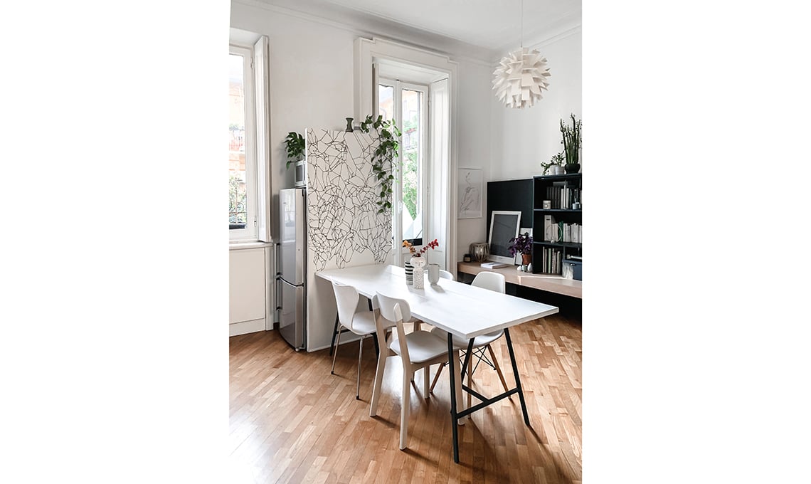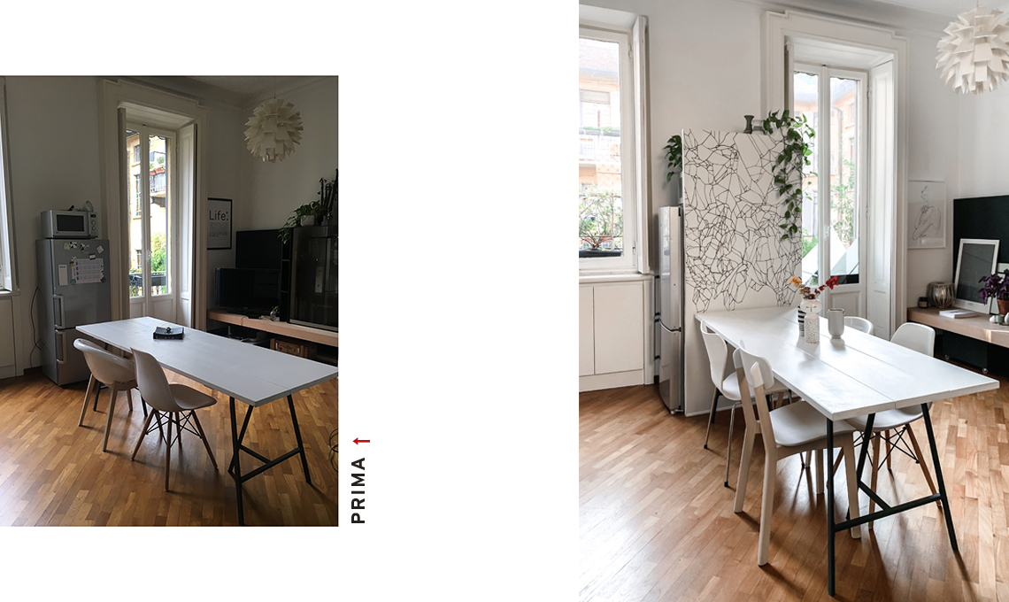 Non potendo sistemarlo in un'altra posizione, ho deciso di ruotare di 90° il frigorifero, verso la cucina. Per schermare il retro dell’elettrodomestico ho usato un mobile Bestå bianco di Ikea che avevo già e che aumenta anche la capacità contenitiva in questa stanza.
