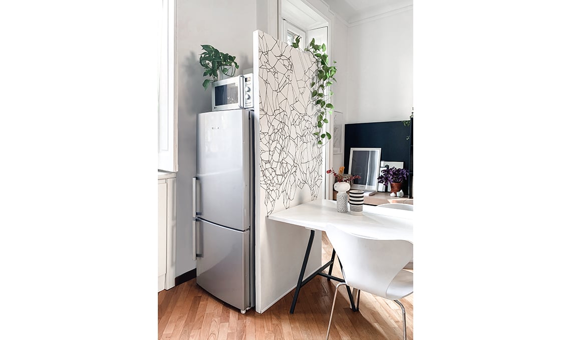 Scopri come ho mascherato il frigorifero nell'open space. È bastato costruire una quinta decorativa in legno e decorarla con la carta da parati.