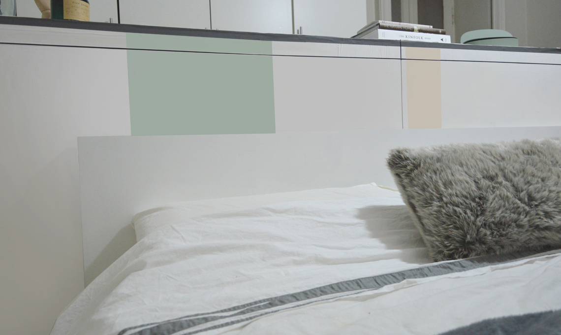 Il mobile testata è in posizione, ora non ti resta che decorarlo. Prima cosa dai un paio di mani (anche tre) di smalto bianco sui pannelli in masonite. Con lo scotch di carta crea le zone da dipingere con i colori e procedi con rullo e pennello nelle parti più piccole. Sistema i washi tape e il gioco è fatto!