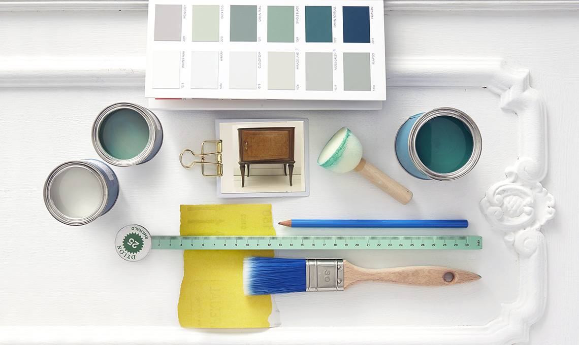 Nella polaroid, il comodino prima del relooking. Attorno, gli attrezzi da