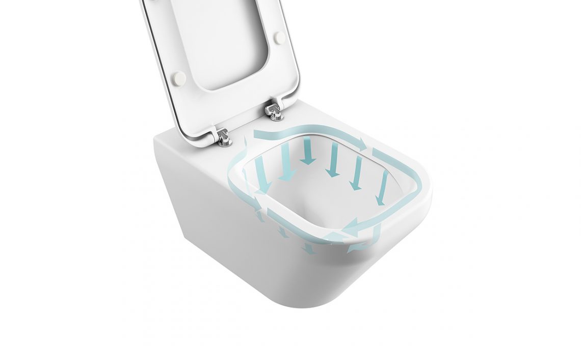 • Il vaso igienico a 360°: il water con sistema di risciacquo senza brida lava l’intera superficie interna; prima una parete d’acqua scorre lungo la parte superiore del vaso, poi un secondo canale spinge l’acqua intorno al bacino, rimuovendo tutto lo sporco.