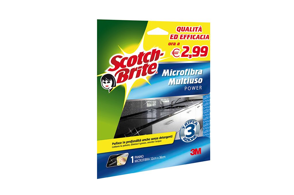 Il panno sgrassante, il panno Microfibra Multiuso Power pulisce in profondità rimuovendo anche i grassi senza l’utilizzo di detergenti [Scotch-Brite® €2,99].