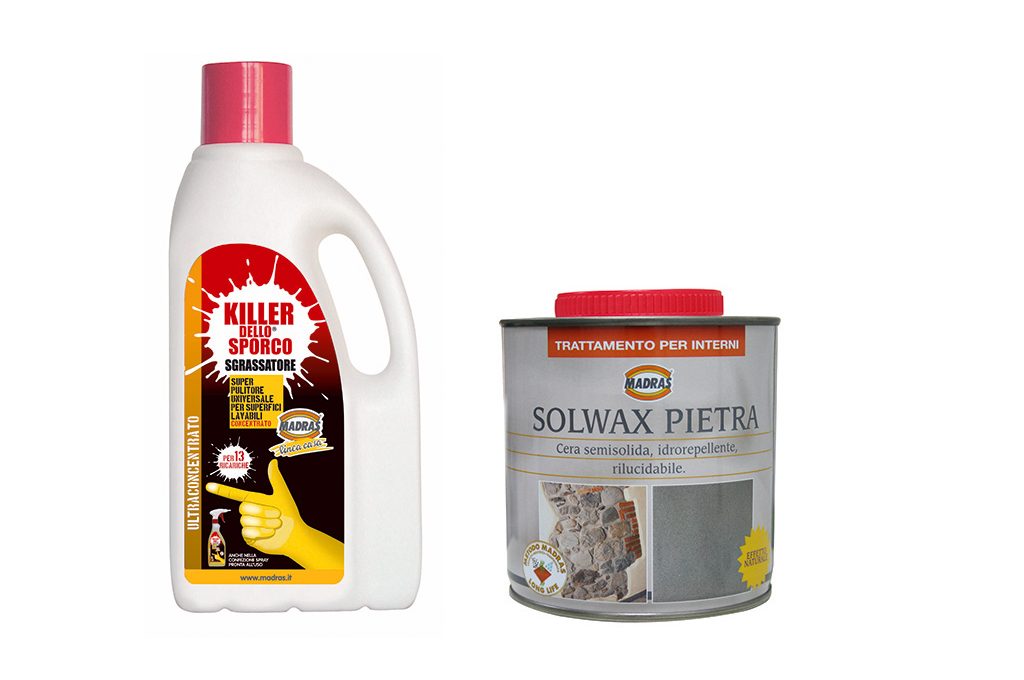 Per macchie di grasso duo vincente: sgrassante Killer dello sporco [€9,50/1 lt] ed emulsione protettiva a base di cere Solvax Pietra [New Madras, €12,30/0,75 lt].