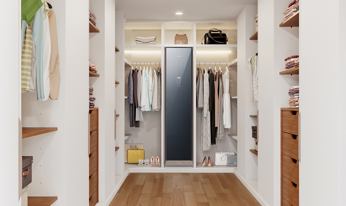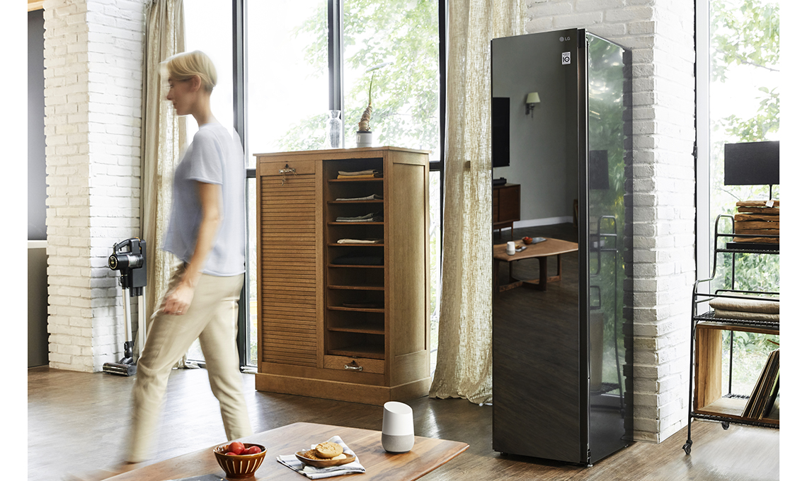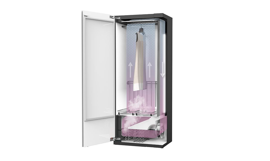 LG Styler igienizza grazie al vapore e, in aggiunta, deumidifica, rinfresca, stira e asciuga fino a 4 capi alla volta. Il ciclo più breve dura 20 minuti. All’interno dello sportello ha un apposito vano che stira i pantaloni [LG].