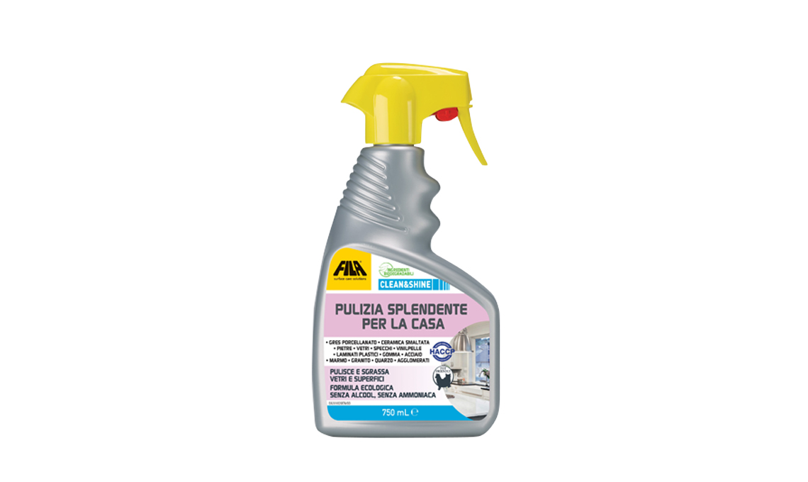 A base di ingredienti biodegradabili, pet friendly, privo di alcool e ammoniaca, Clean&Shine pulisce e sgrassa delicatamente moltissime superfici, tra cui vetri, grès, ceramica smaltata, pietre, laminati e marmo [Fila Solutions]