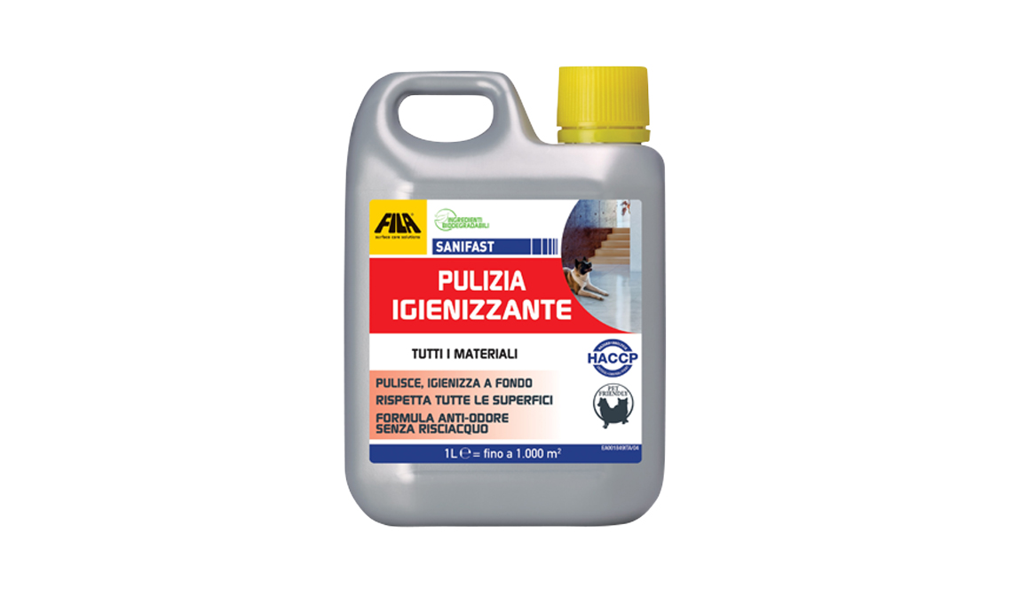 Con ingredienti biodegradabili e privo di fosfati (che causano la proliferazione delle alghe nelle nostre acque), Sanifast igienizza rimuovendo sporco, germi e batteri da tutte le superfici, rispettando gli animali di casa [Fila Solutions]