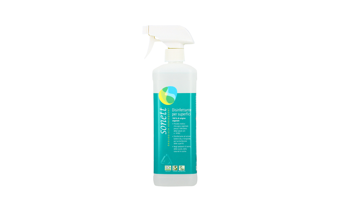 Perfetto per igienizzare anche le maniglie di porte e finestre, il Disinfettante per superfici ha solo componenti di origine vegetale dall’azione battericida e fungicida. È riconosciuto Presidio Medico Chirurgico [Sonett]