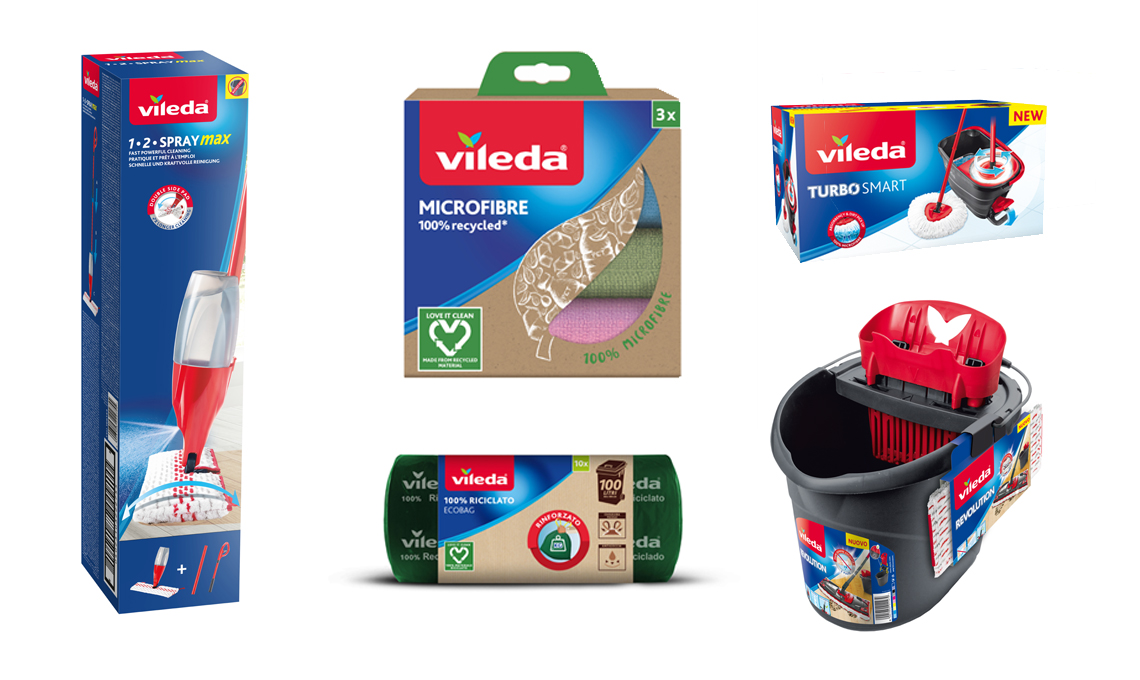 Mai più senza. Con l'iniziativa "Love it Clean" [Vileda] si impegna a favore dell'ambiente con prodotti realizzati con materiali riciclati: dai sacchi per l'immondizia ai opanni in microfibra, fino al sistem ilavapavimenti come Revolution e 1-2 Spray Max.