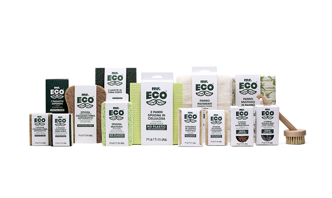 Linea di prodotti per la pulizia Mr. Eco® [MartiniSPA]. Mr. Eco® è la linea di prodotti MartiniSPA realizzata con materiali biodegradabili, riciclabili e fibre naturali, racchiusi in un packaging di carta certificata FSC®