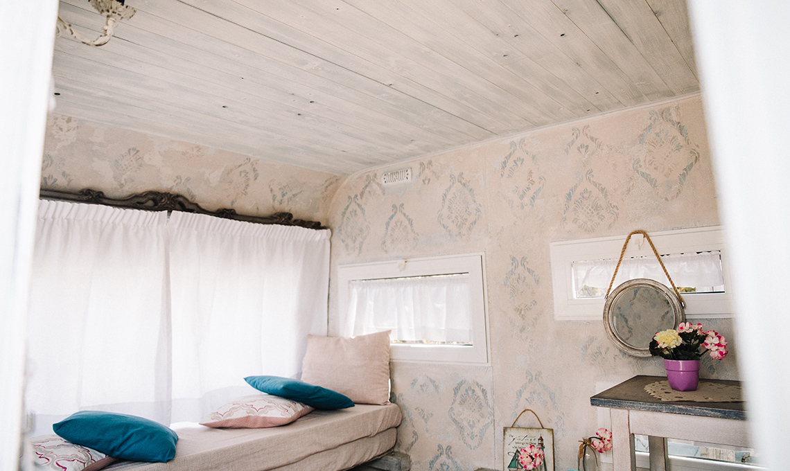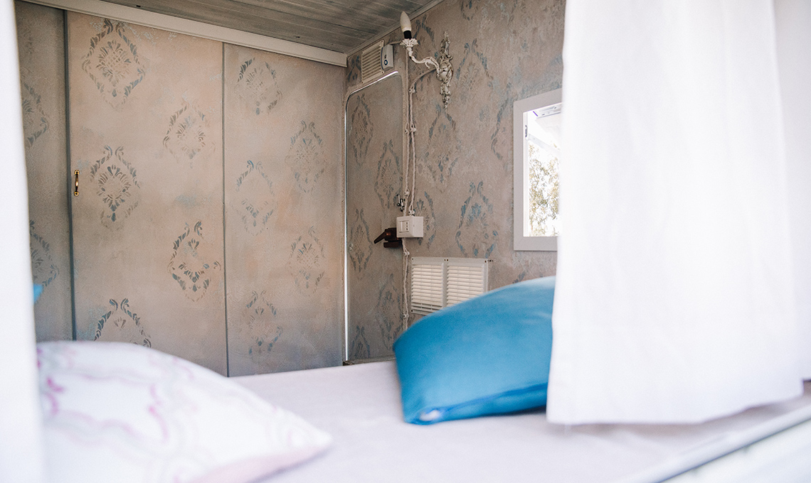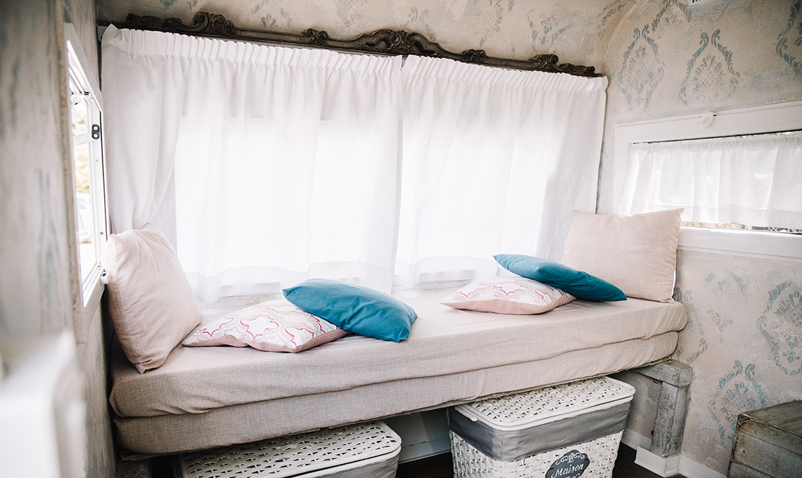 Ho realizzato un divano/letto con due tavole da ponteggio che scorrono una sull'altra e raggiungono la dimensione totale di 140*190, per cui di giorno abbiamo un comodo divano rivestito in cotone cipria con cuscini colorati e di sera un letto alla francese comodo per riposare. Al posto dei tradizionali mobili ho posizionato a vista sotto al divano/letto tre ceste di media grandezza per contenere i nostri capi d'abbigliamento, la biancheria da letto e da bagno e una sacca di cotone porta scarpe. Ho preferito questa opzione per ragioni di "leggerezza". Non volevo ingolfarla di mobili e sentirmi soffocare all'interno e questa scelta si è rivelata veramente un'ottima idea.