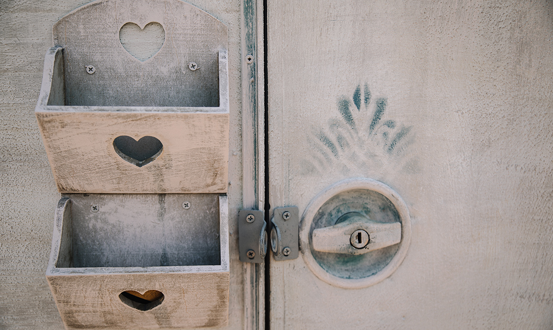 Ho realizzato i copri ruota in legno (patinati), unitamente al fregio posizionato sopra la finestra e al mobiletto che funge da angolo snack. Ho fatto realizzare un piccolo impianto elettrico esterno con cavi a treccia in tessuto bianco che ho colorato di cipria ed abbinato con gli accessori in porcellana classici. Al posto delle tradizionali plafoniere ho messo degli applique in ottone sulle parenti in entrambi gli ambienti perché coerenti con il tutto. La porta di ingresso, anch'essa decorata ad effetto tappezzeria dipinta, si uniforma con il resto della stanza e si distingue solo per la presenza della maniglia color rame.