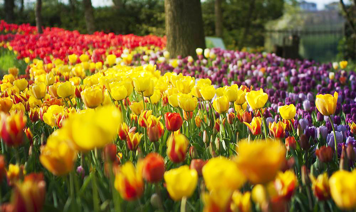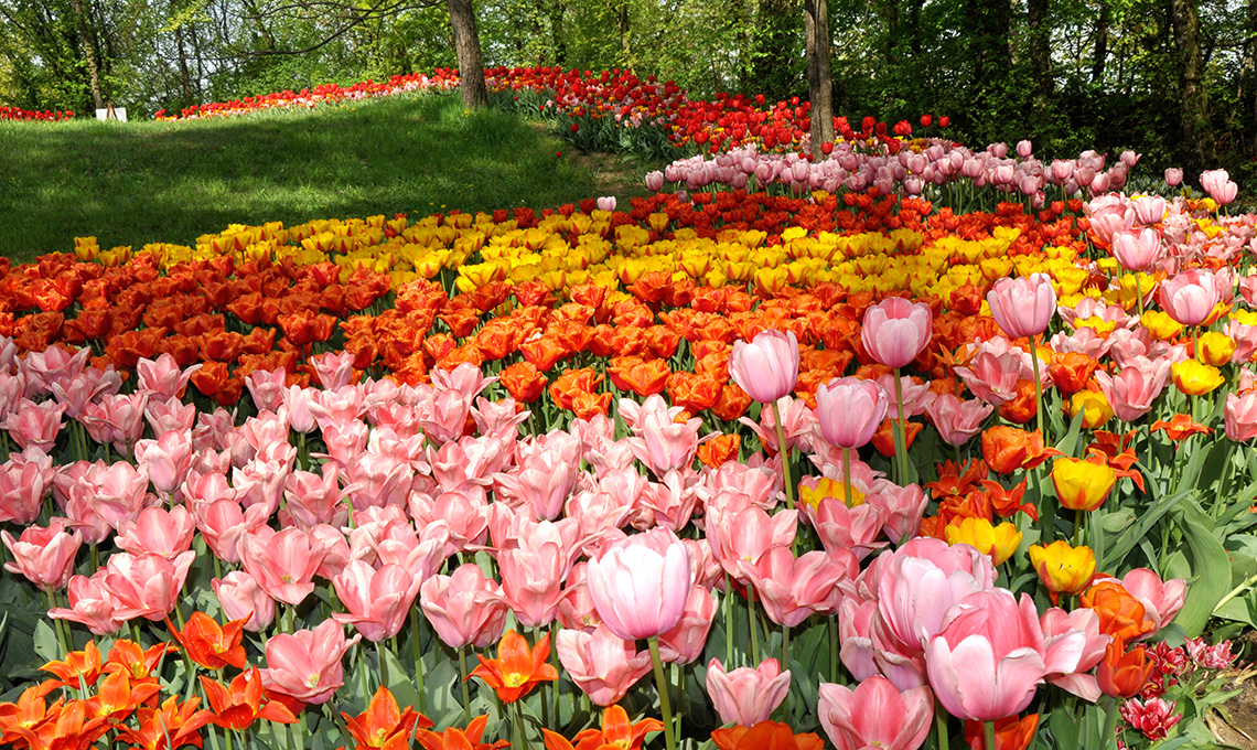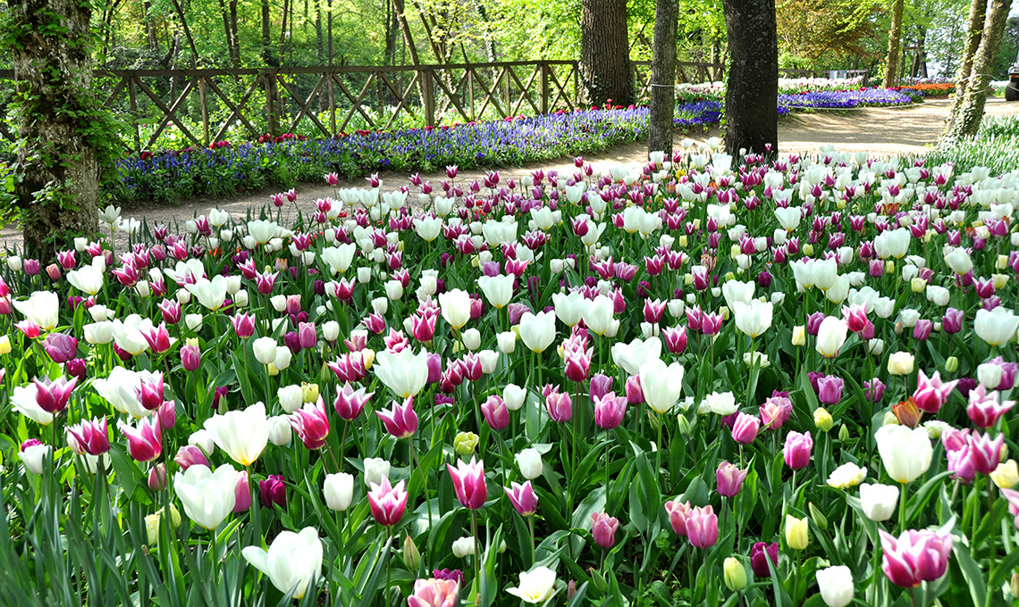 Una collezione di tulipani dalle più curiose varietà: pappagallo, ai viridiflora, tulipani neri, tulipani fior di giglio, frills dalle punte sfrangiate... Le aiuole serpeggiano tra gli alberi secolari, mentre nel sottobosco occhieggiano ciuffi di muscari, di narcisi e di giacinti.
