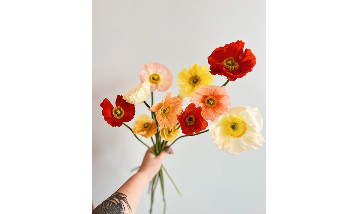 - Inserisci i fiori utilizzando la rete come supporto. Io sono partita dai papaveri per creare l’ingombro della composizione; nel caso decidessi di aggiungere il verde, inizia con quest’ultimo.