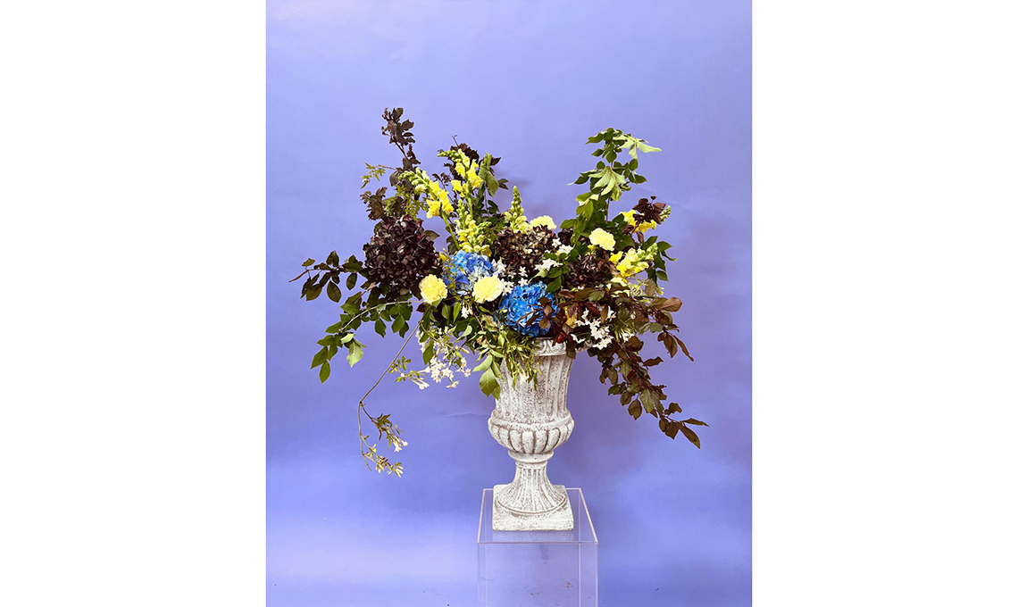 L’Ortensia, inoltre, ha il gambo legnoso, quindi per cogliere i fiori non devi effettuare il taglio in obliquo, ma incidere una X alla fine dello stelo. Anche questa accortezza aiuterà a farle resistere. Per le sue dimensioni maestose l’Ortensia rende ogni composizione ricca ed elegante. Ho pensato quindi di esaltarla con una lavorazione all’interno di un vaso romano: la composizione sarà perfetta per ornare l’ingresso di casa, un salone o un portico. Ho usato fioriture che si trovano facilmente nei giardini, come le fronde di verde e il solanum. Inoltre la tecnica compositiva in rete è sostenibile, perché non usa materiale non riciclabile come la spugna per fioristi. Un ultimo dettaglio prima di iniziare: se vuoi che la composizione duri a lungo, assicurati che tutti i fiori abbiano gli steli lunghi per idratarsi correttamente.