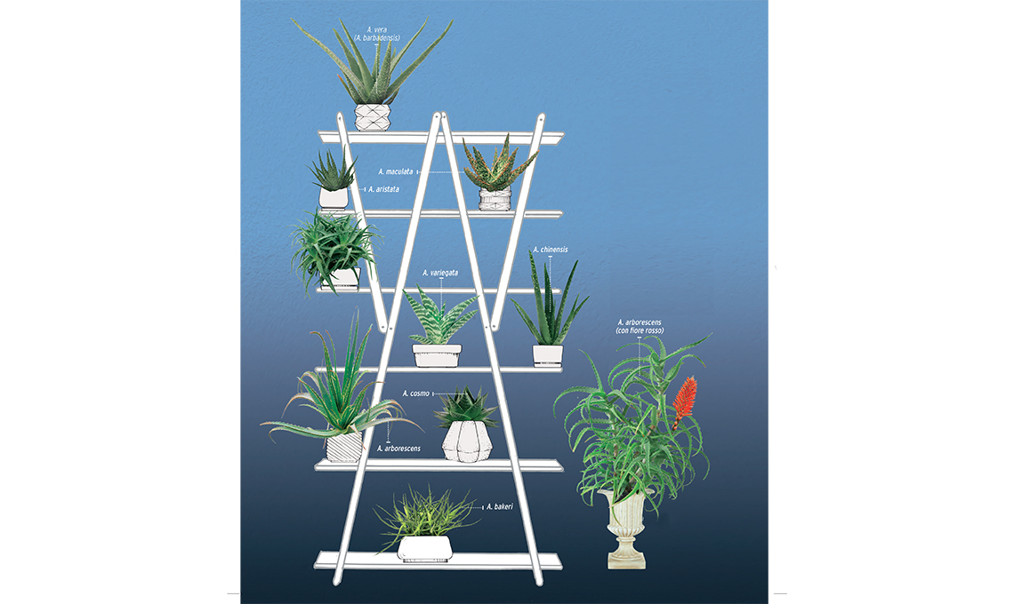 L’aloe è una succulenta che conta centinaia di specie. Quelle più diffuse sono l’aloe vera (o a. barbadensis), composta da lunghe foglie carnose lanceolate, contenenti un gel trasparente, e dai bei fiori gialli; e l’aloe arborescens, riconoscibile per il portamento a cespuglio, il fusto legnoso e le tante ‘rosette’ fogliari cariche di spine e fiori rosso-arancio.