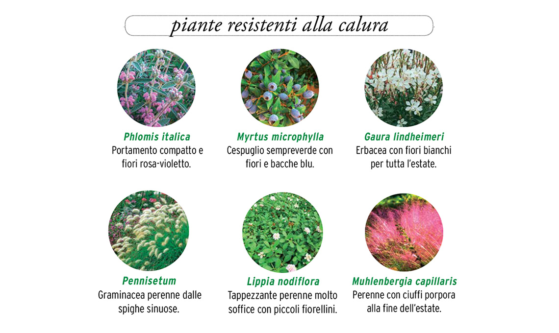 Quali piante consiglia? «Specie che non temono i periodi di aridità. Tra gli arbusti sempreverdi, il Myrtus microphylla e il Pittosporum tobira ‘Nanum’ sono molto resistenti, mentre se si vogliono creare delle pennellate di colore, sono perfette le perenni come Achillea, Agapanthus e Gaura, alternate a morbidi ciuffi di graminacee come Pennisetum e Muhlenbergia capillaris».