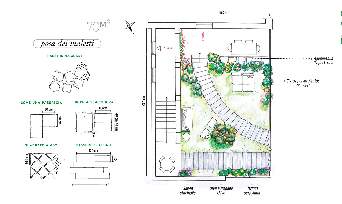 a clima mediterraneo opto per delle tappezzanti resistenti al caldo e alla salsedine come la Lippia nodiflora var. canescens, abbinata alla Verbena hybrida. Dopo l’assestamento iniziale, le irrigazioni si possono limitare a un paio di volte a stagione».