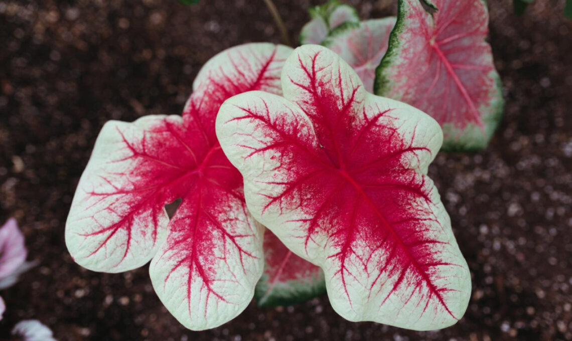 Rarità Da qualche anno il Caladium attira collezionisti e amanti dei fiori. Tra le cultivar più richieste: ‘Raspberry Moon’ con foglie argento e macchie rosse, ‘Pink Illusion’ dai bordi scuri in contrasto con nervature bianche e macchie rosa e ancora ‘Florida Red Ruffles’ e ‘Scarlet Flames’.