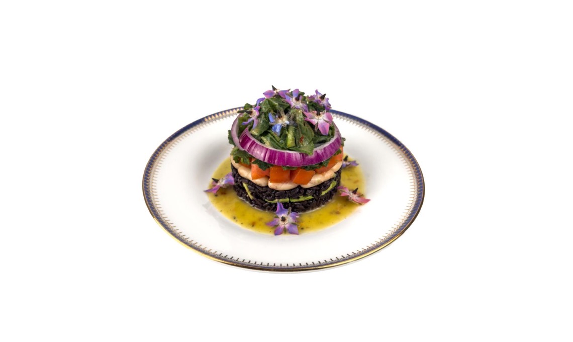 6. Riprendi il piatto, elimina il ring, aggiungi il condimento e decora con i fiori.