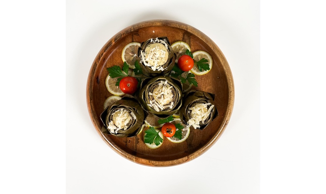 Ingredienti: √ 5 carciofi freschi piuttosto grandi √ 1 limone √ 1 litro di acqua √ 6 fette di pancarrè √ 1 g di aglio in polvere √ 1 ciuffo di prezzemolo √ q.b. sale e pepe √ 60 g di formaggio grattugiato + q.b. per spolverizzare √ 300 ml latte intero √ q.b. olio e.v.o. √ 6 pomodorini (ciliegino, datterino, piccadilly o d’inverno)
