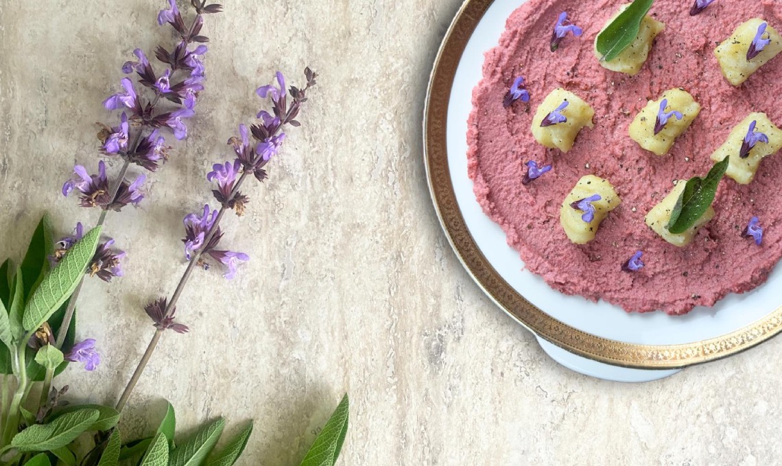 INGREDIENTI Per 4 persone: √ 800 g di patate farinose √ 150 g di farina 0 (dipende dalle patate) √ 1 pizzico di sale fino Per la crema: √ 180 g di anacardi al naturale bolliti 10 min. √ 180 ml di acqua √ 20 g di lievito alimentare in scaglie √ 1 cucchiaio di succo di limone √ 1 pizzico di sale √ 6 foglie grandi di Salvia fresca √ 5 g di polvere di barbabietola rossa (per dare il colore) Per completare: