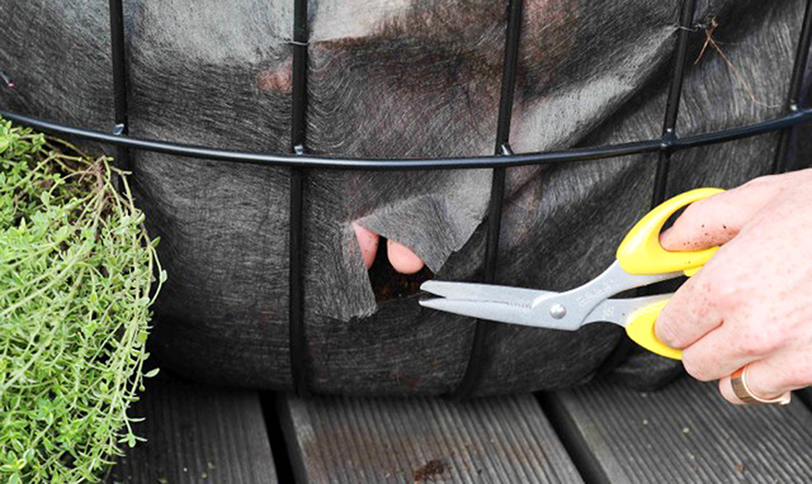 - Con la forbice pratica dei fori a scacchiera sufficientemente grandi per far passare i rami delle piantine che inserirai. Poi, come sostegno, lega tre pezzi di corda da cm 80 lungo il bordo.