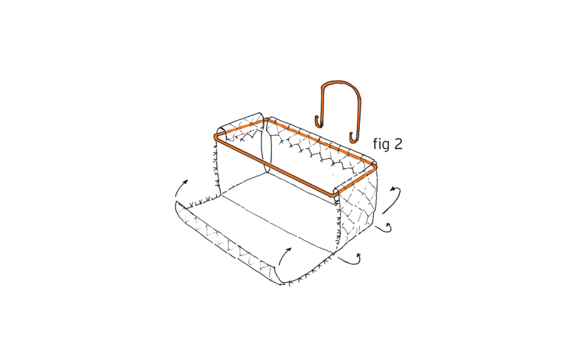- Con il filo in rame, sagoma un rettangolo da cm 7x15 e con due pezzi da cm 20 crea i manici a U. Piega i lembi della rete verso l’interno come un risvolto e agganciali al rettangolo di rame.