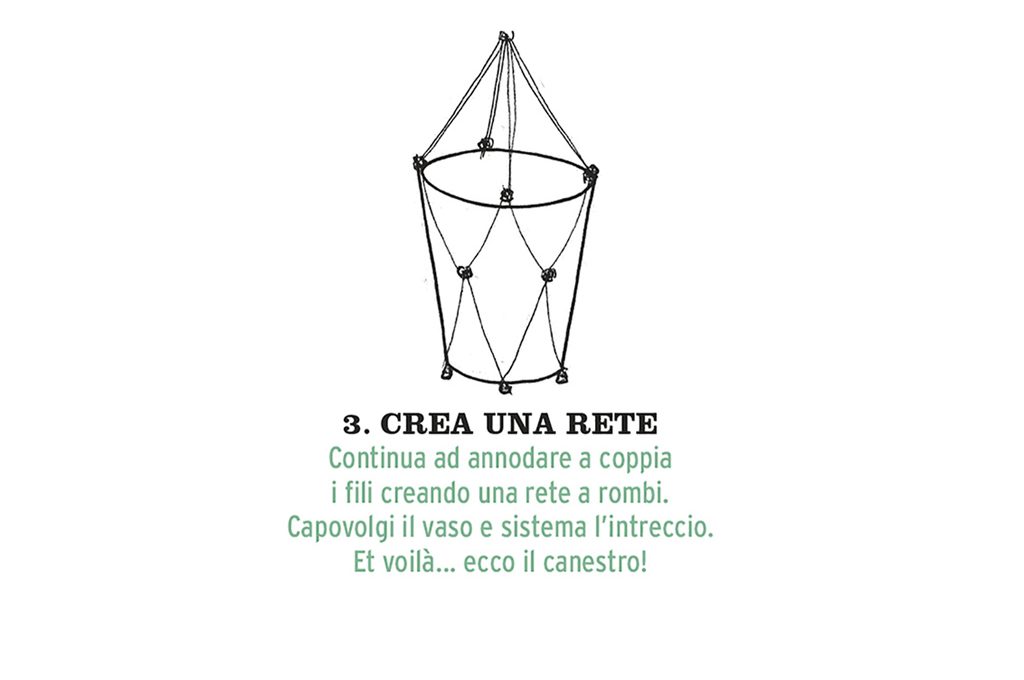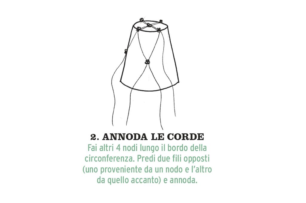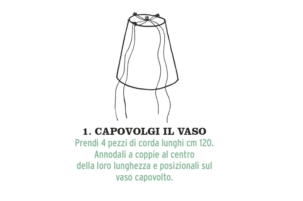 1. Procurati 4 pezzi di corda in nylon colorato lunghi cm 120. Annodali a coppie al centro della loro lunghezza e appoggiali sul vaso capovolto. 2. Fai altri quattro nodi lungo il bordo della circonferenza. Prendi due fili opposti e annodali. 3. Continua ad annodare a coppie i fili creando una sorta di rete a rombi. Capovolgi il vaso e sistema l'intreccio.
