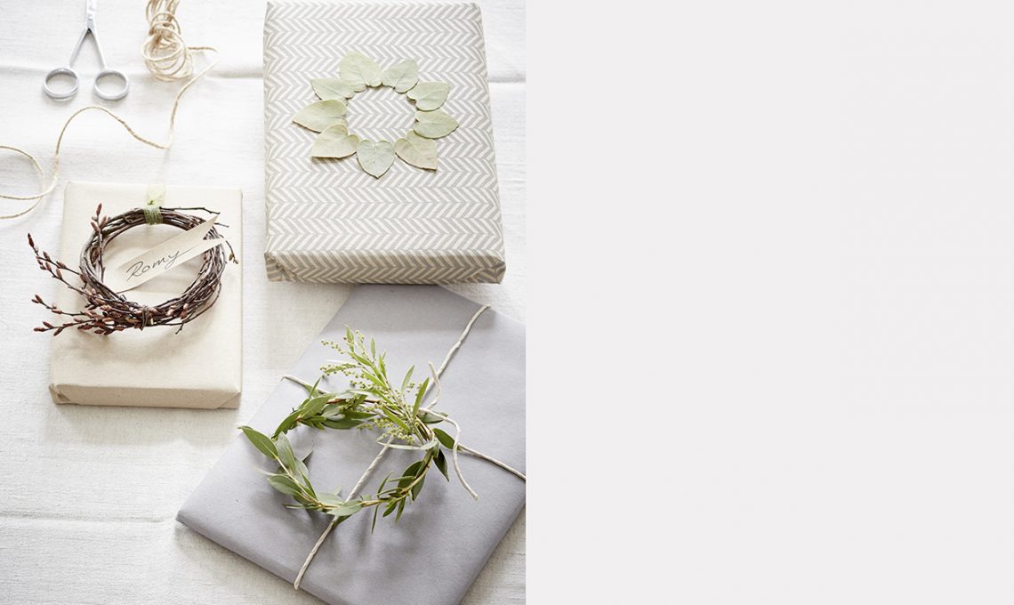 Sono avanzati dei rametti? Non buttarli! Ti serviranno per decorare i pacchetti regalo. Crea mini ghirlande da legare con nastrini o da fissare con il biadesivo. Puoi anche applicare le foglie direttamente sui cadeaux natalizi, da personalizzare con semplici bigliettini in nuance con la carta regalo.