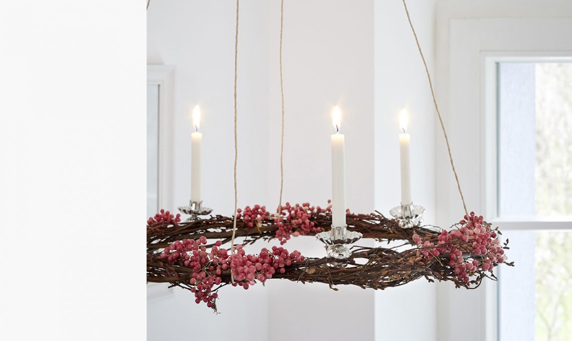 Intreccia rami di salice, aggiungi bacche di rosa canina e cotoneaster poi lega i quattro sostegni e incolla il supporto delle candeline per una super scenografica ghirlanda sospesa.