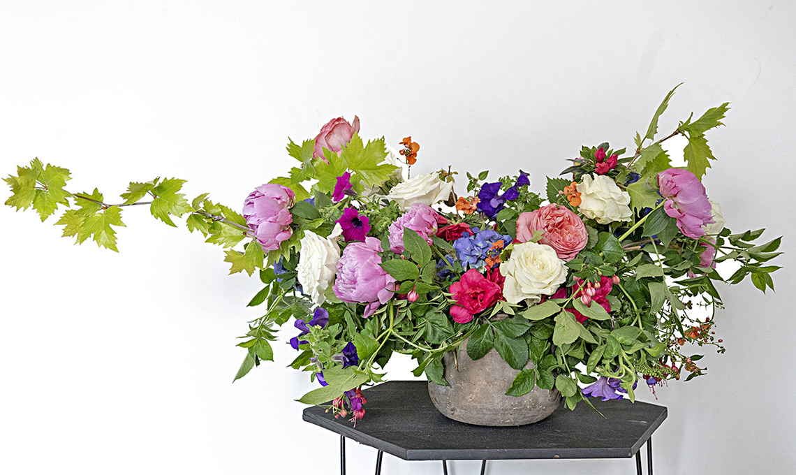 Come le peonie di questa composizione, creata con elementi del suo giardino.