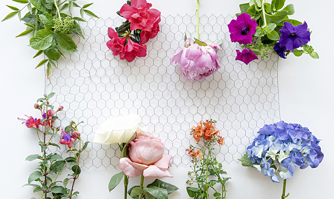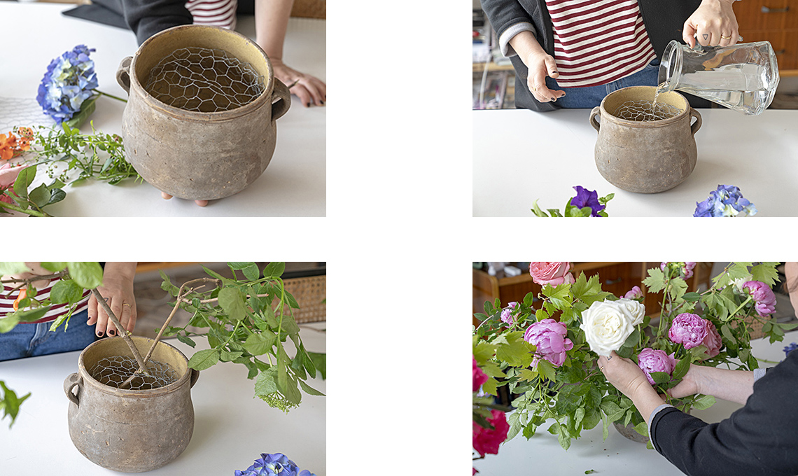 - Prosegui con peonie e rose. Poi quelli più piccoli di finitura: fucsia, surfinia e azalea. L’ortensia lasciala per ultima. Con questo sistema, a differenza della spugna, puoi togliere i fiori e rimetterli. Inoltre, la rete si può riutilizzare per altre composizioni.