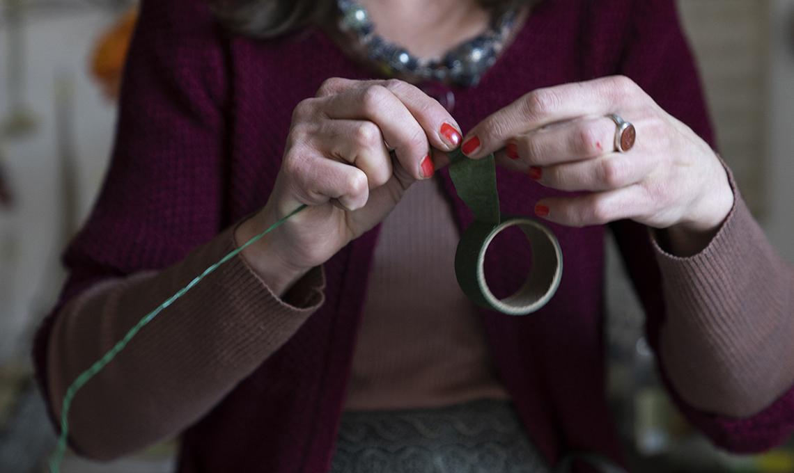 - Avvolgi con la guttaperga la base appena creata. In alternativa puoi optare per una piccola rete metallica rivestita di tessuto e attaccare i fiori con la colla a caldo.