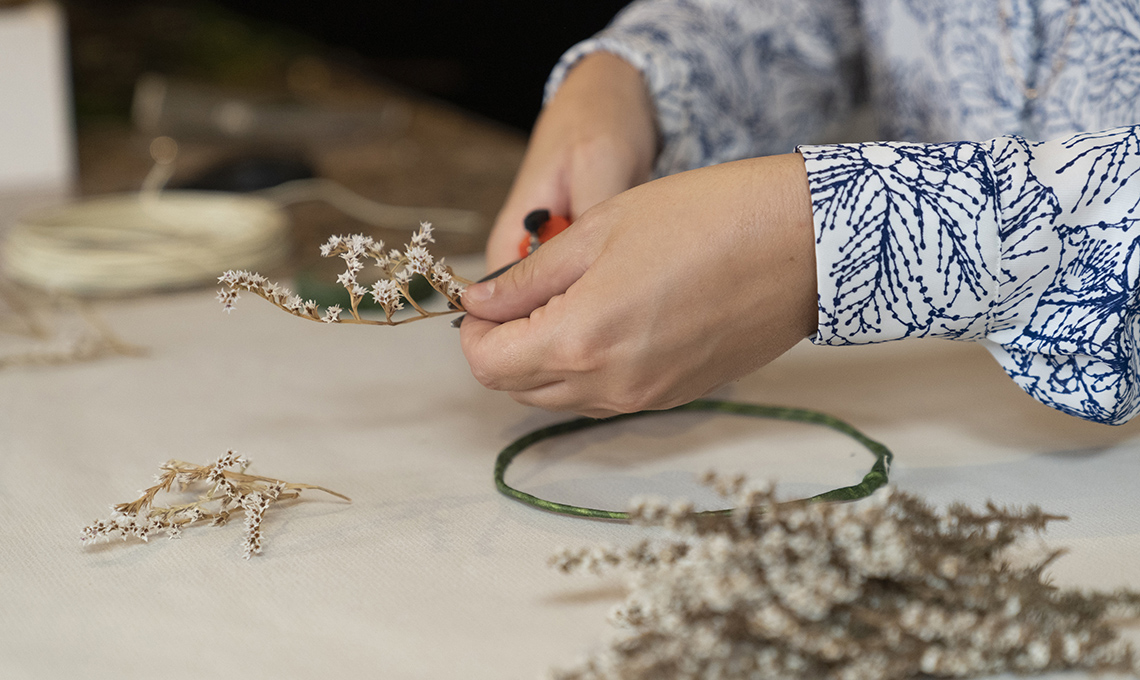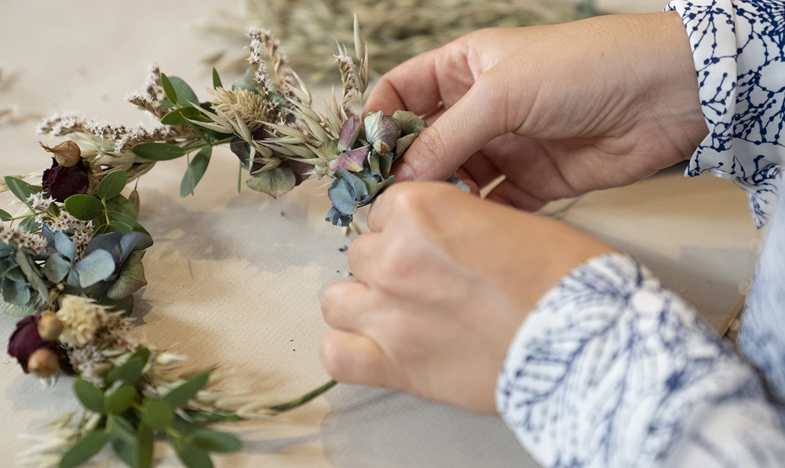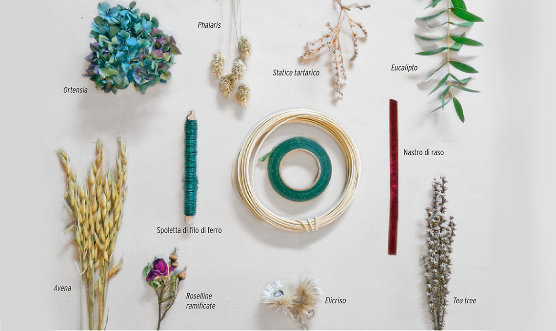 - Passa alla preparazione dei fiori: taglia le diverse varietà in rametti di 5-6 cm, secondo la dimensione del tuo cerchio. Noi abbiamo giocato sui toni del beige con tocchi di bordeaux (le roselline) e azzurro (le ortensie).