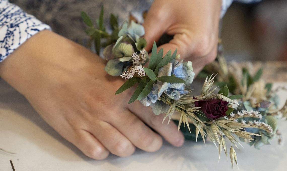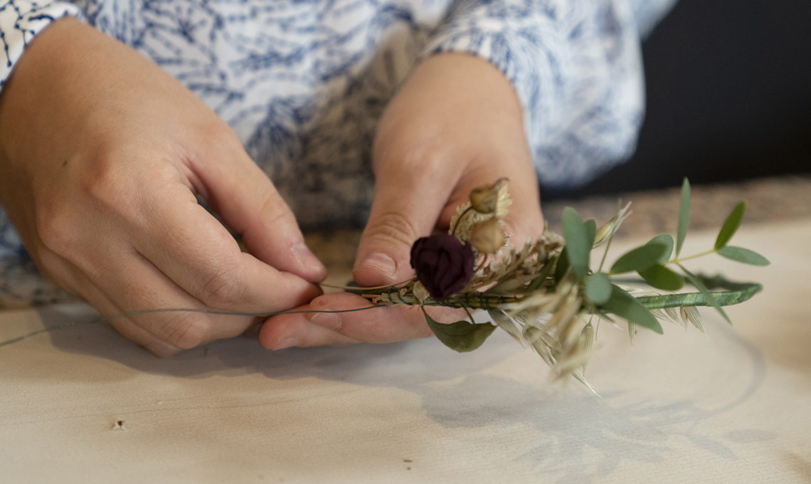 - Quando arrivi alla fine, i gambi dei fiori già attaccati dovranno entrare nella punta di quello che stai per inserire. Per ultimo chiudi con un elemento abbastanza grande, come l’ortensia, per mascherare l’incastro, e termina con più giri di spoletta.