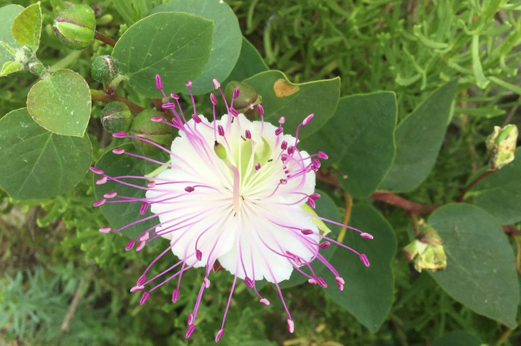 Il cappero ha raffinati fiori bianchi con ‘lunghe ciglia’ viola. A Salina i suoi prelibati frutti vengono chiamati Cucunci. Questa pianta, fiorisce in tutto il bacino del Mediterraneo in modo spontaneo su rupi e falesie o, direttamente sui muri, formando dei rami folti e ricadenti. Con molta pazienza... e i nostri consigli la puoi coltivare anche in vaso.
