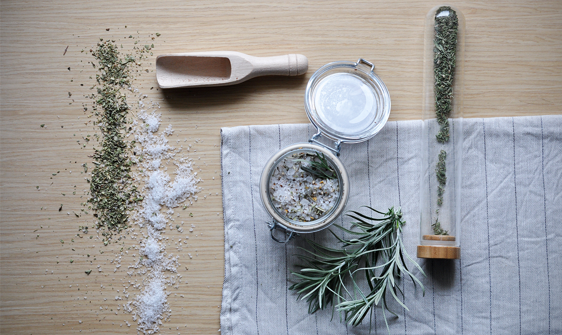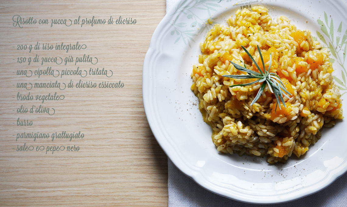 Sale o aceto aromatizzati per insaporire pesce, carne e verdure e un paio di ricette profumate: risotto con la zucca al profumo di elicriso e tagliatelle con pesto di elicriso, mandorle e bergamotto (gli ingredienti sono nelle foto).