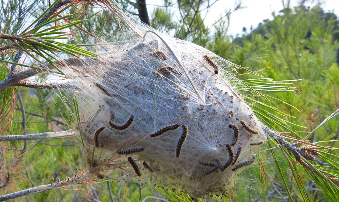 La processionaria del pino (Thaumetopoea pityocampa) è un bruco defogliatore dannoso per le conifere e pericoloso per l’uomo, perché ricoperto di peli urticanti. Si combatte con apposite trappole ai ferormoni, oppure con la rimozione meccanica.