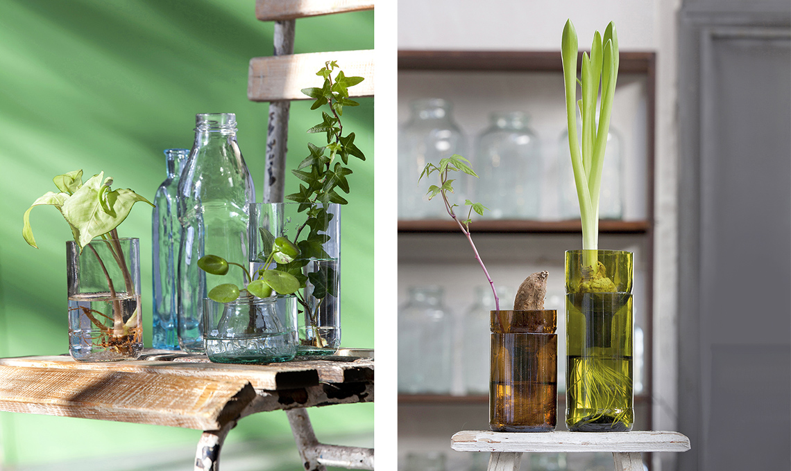 In acqua, la classica patata americana o i bulbi regalano fluenti rami pieni di foglie e fioriture strepitose. Hai mai provato a riciclare le bottiglie in vetro? Se le tagli e capovolgi, sono dei perfetti vasi.