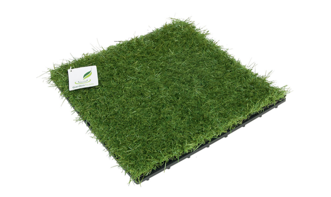 Pedane Runnen in prato artificiale facili da agganciare l'una all'altra, perfette sul balcone o sul terrazzo [Ikea, cm 30x30x2, 9 pezzi in ogni confezione, € 39,95/m²].