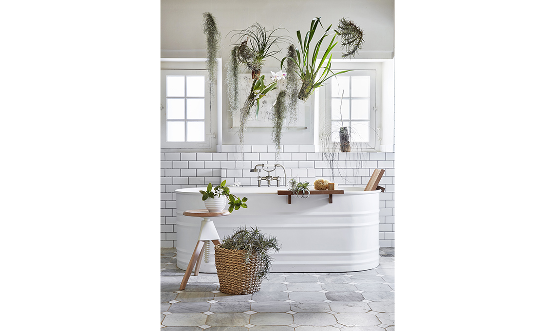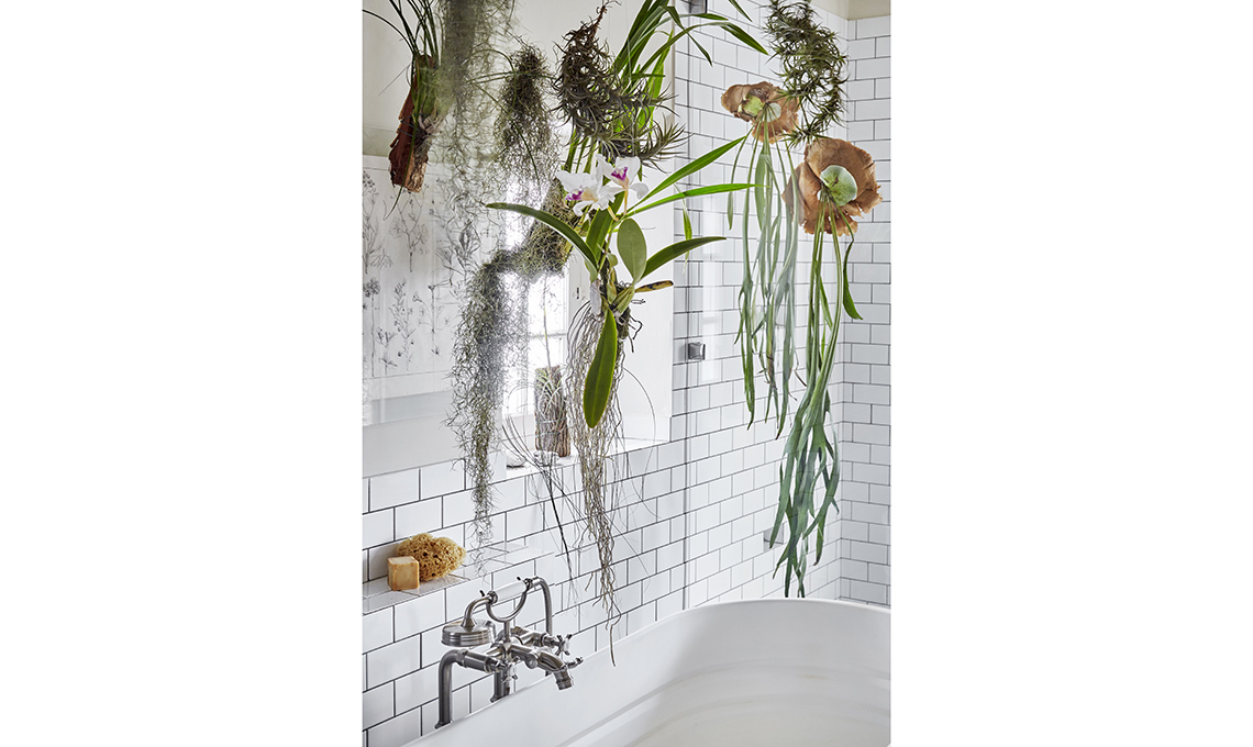 - Per dare un movimento ottico d’effetto, appendi più vasi ad altezze diverse su un bastone in legno fissato in orizzontale a due catenelle agganciate al soffitto.
