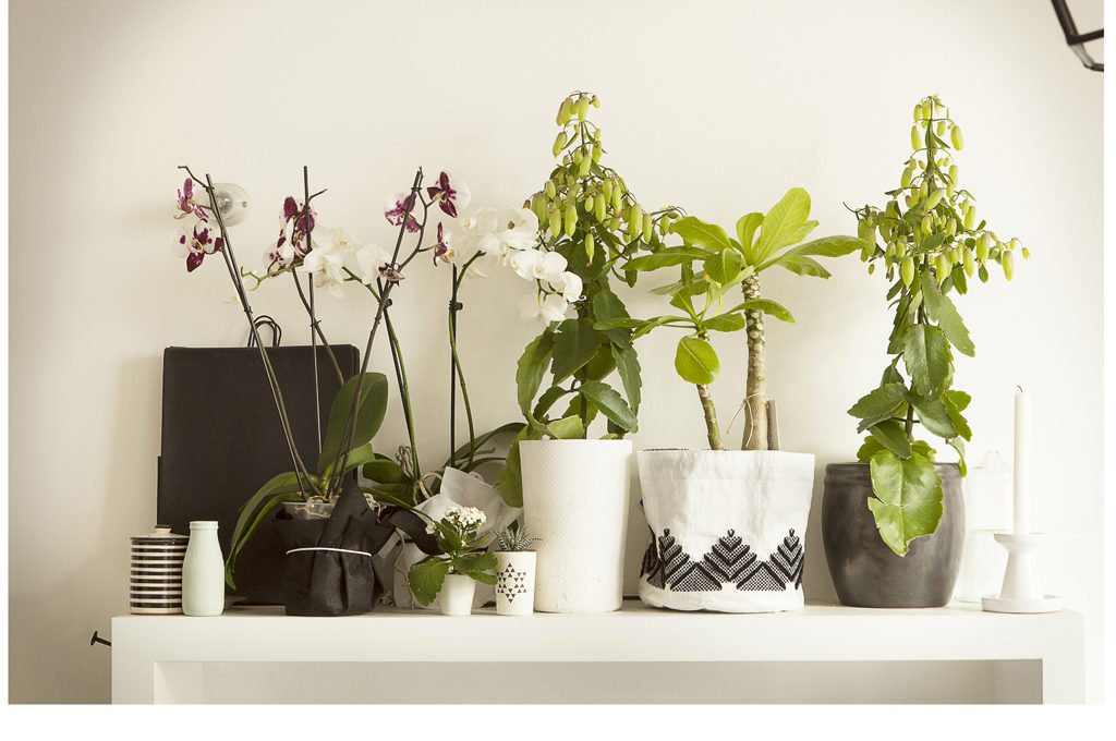 Miscela piante verdi a fiori in vaso. Vale sempre la regola del gruppo: insieme sulla mensola o sul mobile sono più... spettacolari! Ci deve essere un motivo conduttore che li leghi. Noi abbiamo scelto vasi e cachepot il bianco e nero in versione geometrica. Non male vero?